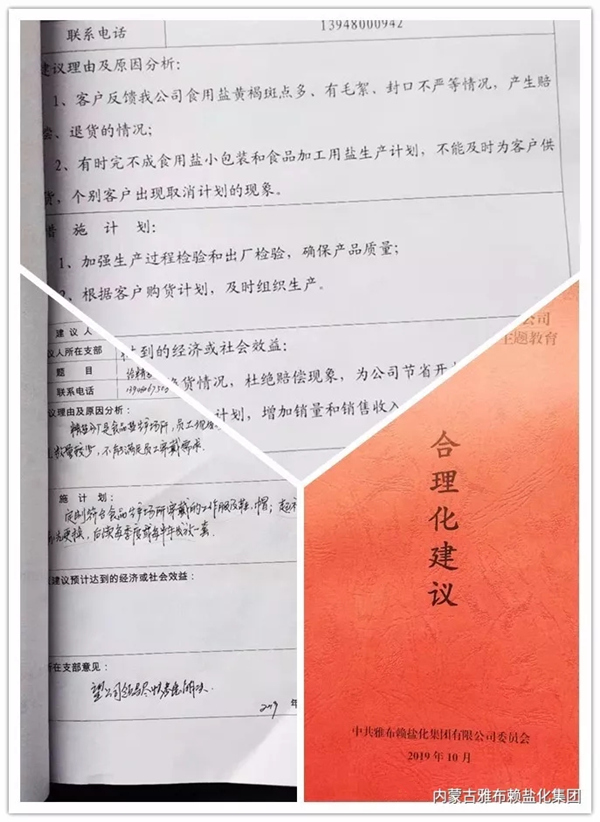 一是在采盐、精盐分厂党支部,通过学习研讨、讲党课等形式,教育引导党员坚定理想信念,牢记党的宗旨,不忘初心,牢记使命,以高度的责任心和使命感,以锐意进取的精神、昂扬向上的斗志和饱满的工作热情投身各项生产。组织开展“攻坚克难抓落实”行动,动员全体党员在急难险重任务中勇挑重担,针对当前原盐、食用盐生产中存在的问题,要求分厂党员每人至少提一条改进工艺设备、提升安全质量效益等的合理化建议,努力把生产效率、安全质量等工作提升到新的档次。二是在机关所属各党支部开展“我为管理建一言”、“我为发展献一策”活动,针对公司发展过程中存在的短板问题,组织党员为提升企业现场管理、质量管理、安全管理水平以及拓展食用盐市场、盘活公司闲置资产等方面出谋划策,群策群力助推企业走出困境。